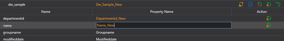 Once you change the name, a number of restore buttons appear on the action bar of the DataWindow object and the DataWindow column. You can use these restore buttons to efficiently restore to the default names.