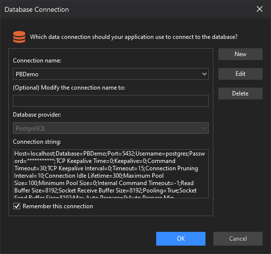 Before converting DataWindows to C# models, you must create a connection to the database (or the data source) you used to create the DataWindow objects. Once created successfully, the connection will be saved (in Server dropdown list) in the DataWindow Converter so that you can select it next time, instead of creating it from scratch again. You cannot modify a database connection in the DataWindow Converter, however, you can remove it from the Server dropdown list by clicking the x icon.