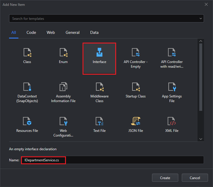 In the Add New Item dialog, select Interface . Name it as IDepartmentService.cs and click Create.