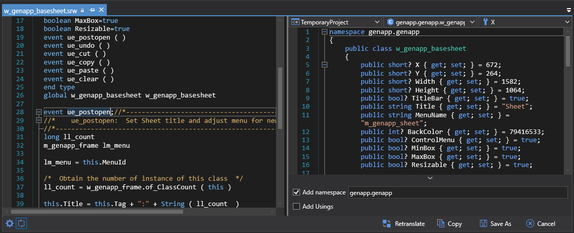 The original PowerScript and the translated code of the object will display in the editor side by side.