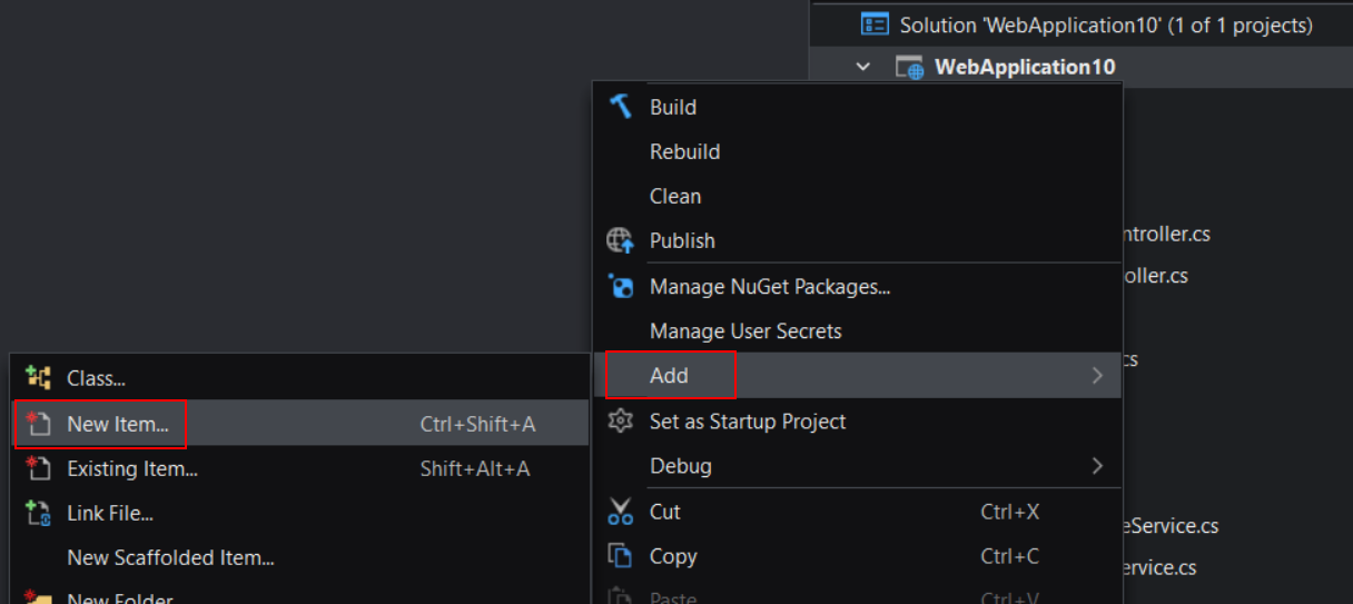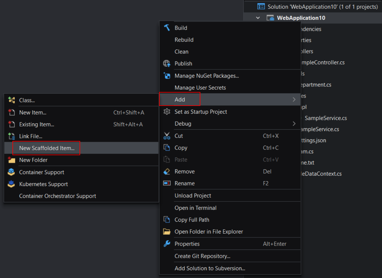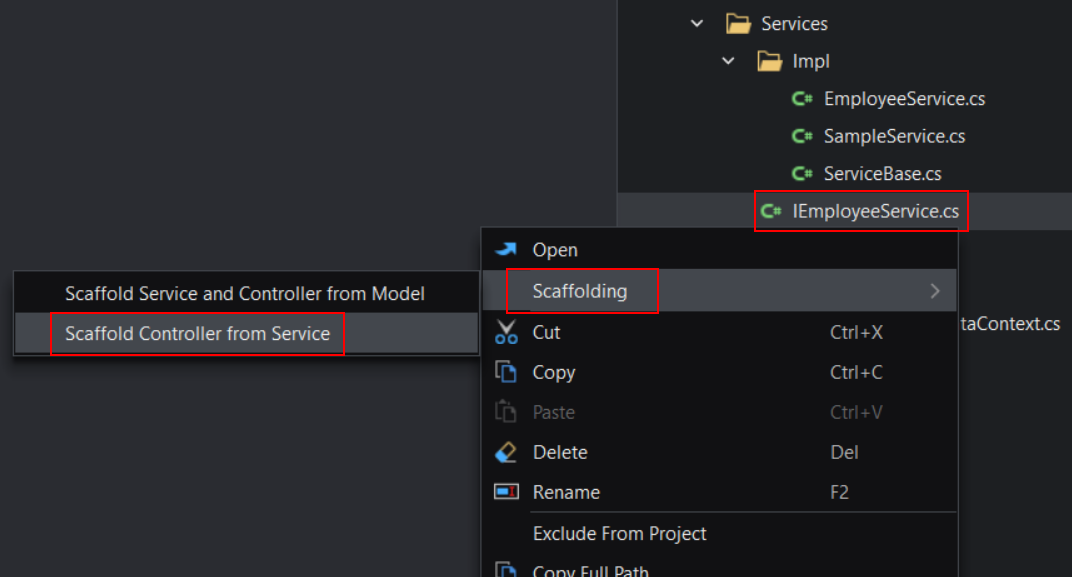 You may see options related to scaffolding in the right-click menu of any .cs file or the folder containing the .cs file (eg. Scaffolding > Scaffold Service and Controller from Model or Scaffolding > Scaffold Controller from Service ), but not all .cs files are suitable for scaffolding feature. Make sure to choose the appropriate cs. file to use the scaffolding feature, for example, you can only scaffold service and controller from a model file, and scaffold a Controller from the Services directory or the Service's Implementation file.