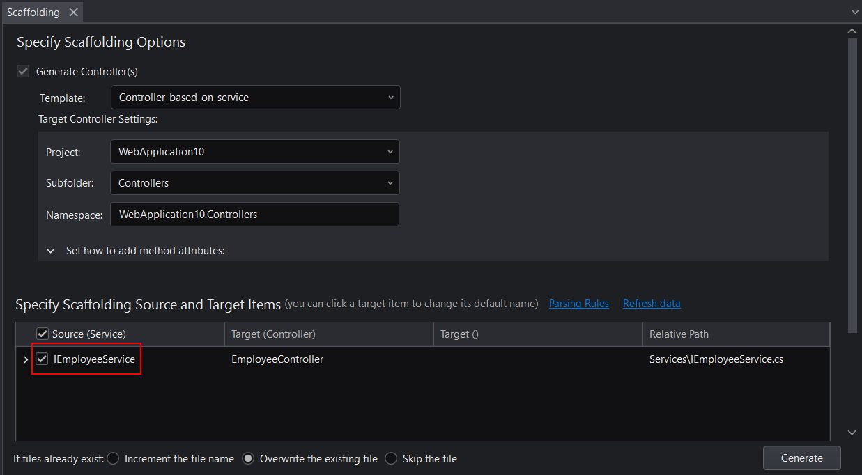 Right-click the interface file (or the Services node) and select Scaffolding > Scaffold Controller from Service.
