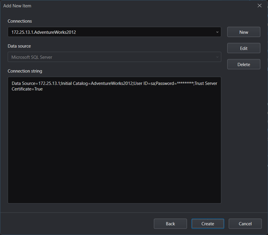 If you have created a database connection before (for example in DB Server Explorer), the created database connection will be displayed here, you can select an existing connection from the Connections drop-down list, or click New to create a new connection. Successfully created connections will automatically appear in the DB Server Explorer. You can manage these connections in DB Server Explorer. See Database Connections for details.