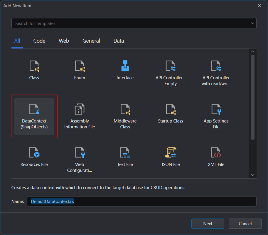 Select DataContext (SnapObjects). Specify the DataContext file name. Click Next.