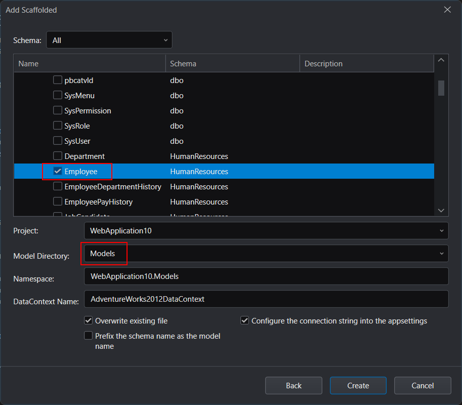 Models\Employee.cs: This is the entity class model converted from the database table. It maps to the