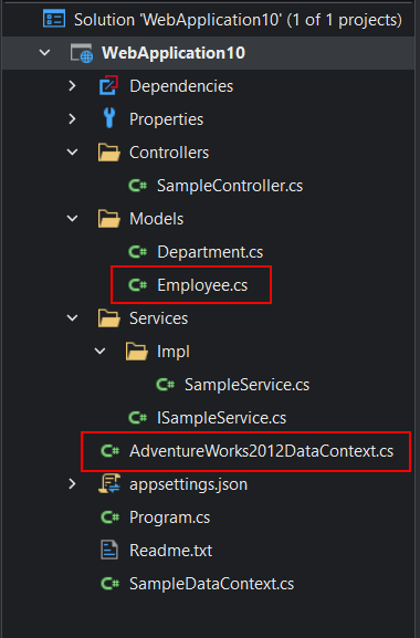 Employeetable in the AdventureWorks2012 database.Services folder: This folder contains services that perform data operations on the model. A service typically separates its interface from the implementation of that interface. The interface only contains declarations of methods, properties, and events.