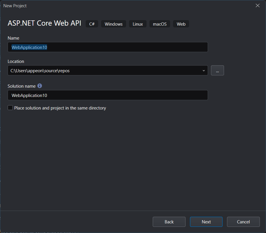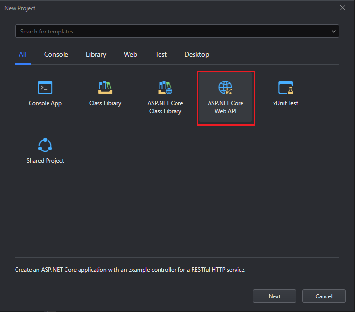 In the New Project dialog box, select ASP.NET Core Web API from the template list, and then click Next.