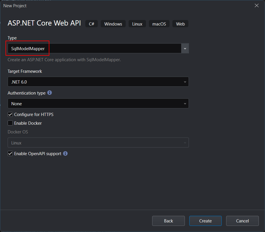 Below we will show how to create a Web API project of type SqlModelMapper (the project will contain samples of SqlModelMapper model, DataContext, controller, service, etc.).