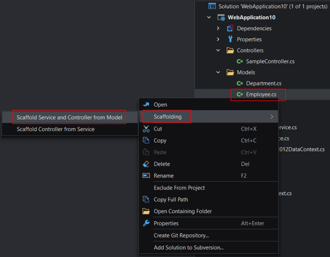 Right-click the model file (or Models node) and select Scaffolding > Scaffold Service and Controller from Model.