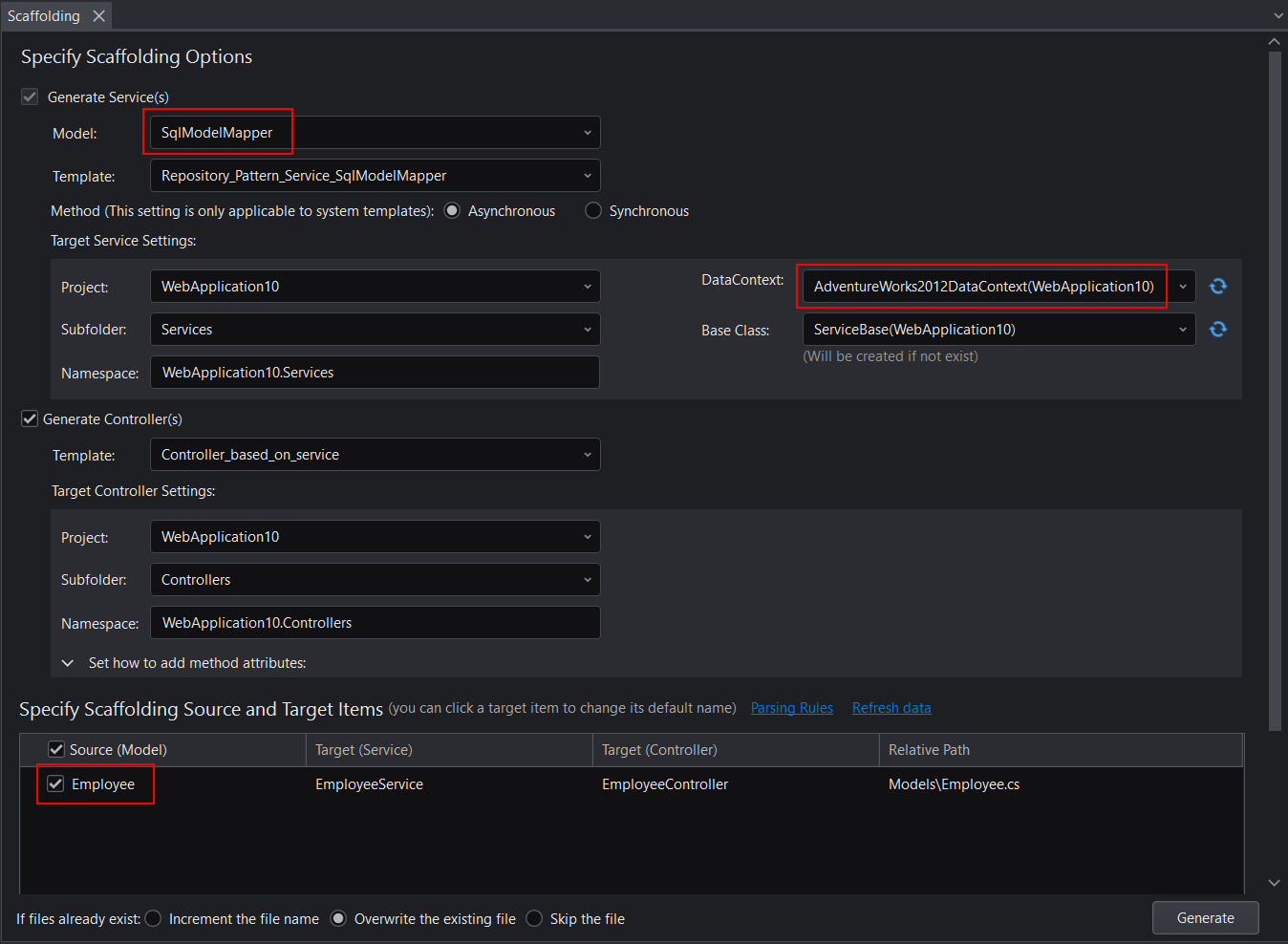 In the previous section we created a Web API project (including sample files of SqlModelMapper model, DataContext, controller, and service). In this section we will use the scaffolding feature to generate model and DataContext in this project.