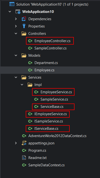 Controllers\EmployeeController.cs: The controller is based on the existing service interface. For example,