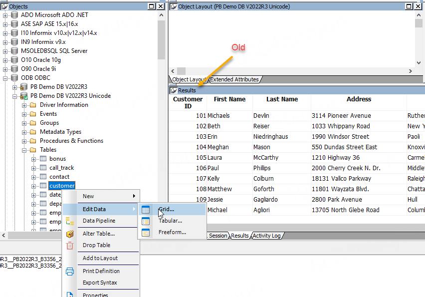 Database Painter — Edit Data shows table/view name and DB profile