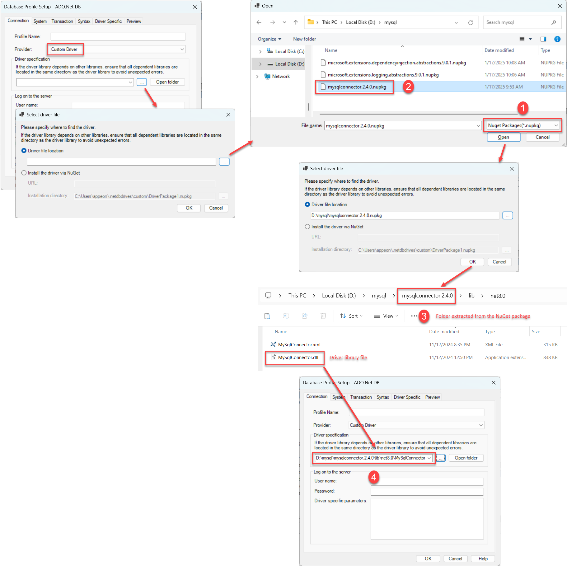 In the Open dialog box, you can change the file type filter to .nupkg (①) and then select the NuGet package file on the local machine (②). InfoMaker will extract the contents of the NuGet package in the directory where it is stored (③), and then search for the driver library file within the extracted folder. The full path of the driver library will then be added to the Driver specification section (④) and the database connection string.