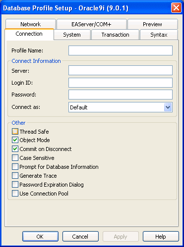 Each database interface has its own Database Profile Setup dialog box where you can set interface-specific connection parameters. For example, if you install the O90 interface and then select it and click New in the Database Profiles dialog box, the Database Profile Setup - Oracle 9i dialog box displays, containing settings for those connection options that apply to this interface.
