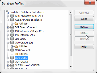 The Database Profiles dialog box uses an easy-to-navigate tree control format to display your installed database interfaces and defined database profiles. You can create, edit, and delete database profiles from this dialog box.