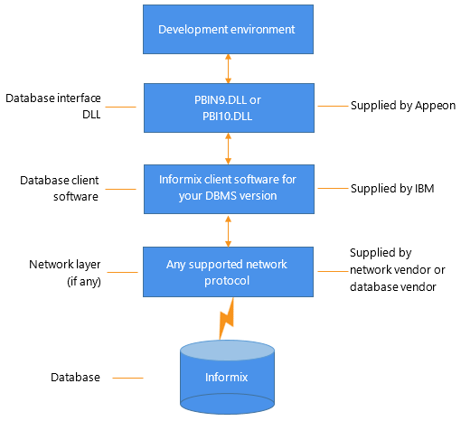 The following figure shows the basic software components required to access an Informix database using the native Informix database interfaces.