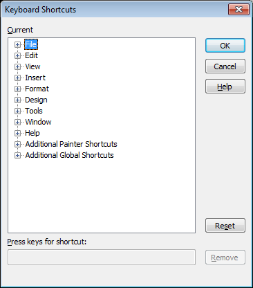 In a painter, the Keyboard Shortcuts dialog box includes both menu items as well as additional actions that apply to the current painter or tool. These nonmenu actions are listed under Additional Global Shortcuts and Additional Painter Shortcuts. For example, the painter shortcuts for the Form and Report painters include items from the Stylebar.