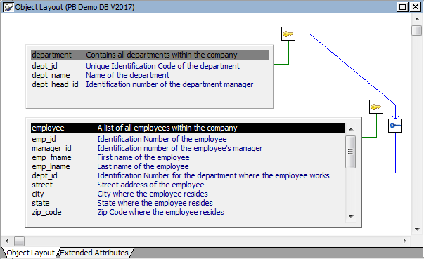In InfoMaker, columns defined as keys are displayed with key icons that use different shapes and colors for primary and foreign. InfoMaker automatically joins tables that have a primary/foreign key relationship, with the join on the key columns.