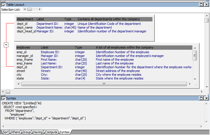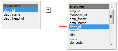 In the following screen, the Employee and Department tables are joined on the dept_id column: