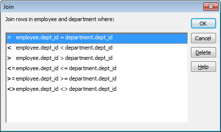 If your DBMS supports outer joins, outer join options also display in the Join dialog box. For example, in the preceding dialog box (which uses the Employee and Department tables), you can choose to include rows from the Employee table where there are no matching departments, or rows from the Department table where there are no matching employees.