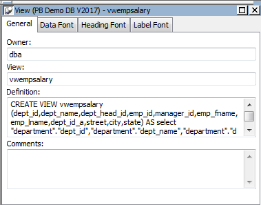 A database view gives a different (and usually limited) perspective of the data in one or more tables. Although you see existing database views listed in the Objects view, a database view does not physically exist in the database as a table does. Each time you select a database view and use the view's data, InfoMaker executes a SQL SELECT statement to retrieve the data and creates the database view.