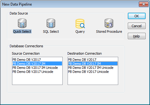 To create a pipeline, the databases you want to use for your source and destination must each have a database profile defined. If you do not see profiles for the databases you want to use, select Cancel in the New Data Pipeline dialog box and then define those profiles. For information about defining profiles, see Changing the destination and source databases.