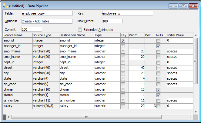 When you finish defining the data to pipe, the Data Pipeline painter workspace displays the pipeline definition, which includes a pipeline operation, a check box for specifying whether to pipe extended attributes, and source and destination items.