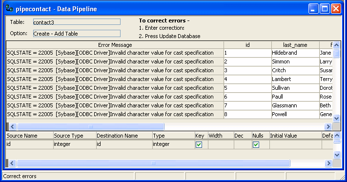 You can correct the error rows by changing one or more of their column values so the destination table will accept them, or you can ignore the error rows and return to the Data Pipeline painter workspace. If you return to the workspace, you cannot redisplay the error rows without re-executing the pipeline.