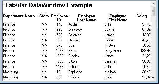 The Tabular presentation style presents data with the data columns going across the page and headers above each column. As many rows from the database will display at one time as can fit in the report. You can reorganize the default layout any way you want by moving columns and text: