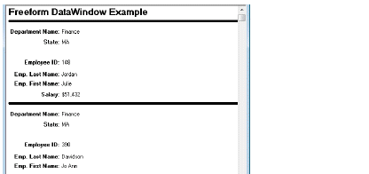 The Freeform presentation style presents data with the data columns going down the page and labels next to each column. You can reorganize the default layout any way you want by moving columns and text.