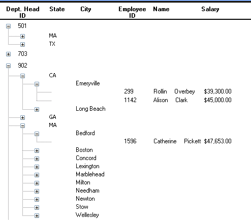 This TreeView style report groups by manager ID and state and lists employee information and salaries: