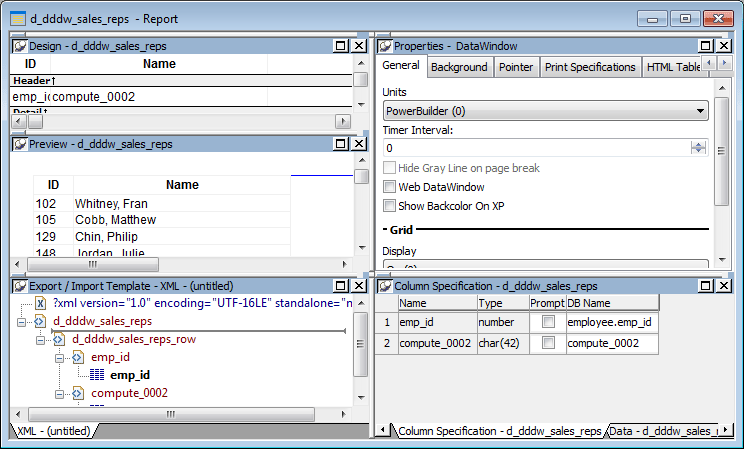 The Export/Import Template view for XHTML is designed for use with the Web DataWindow feature in PowerBuilder. This view, and the Web Generation and JavaScript Generation tab pages in the Properties view, are not used in InfoMaker.