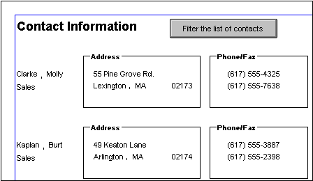 To visually enhance the layout of a report, you can add a group box. A group box is a static frame used to group and label a set of controls in a report. The following example shows two group boxes in a report. The Address group box groups address information and the Phone/Fax group box groups telephone numbers.