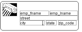 In the following label, emp_lname, the comma, state, and zip_code are specified as slide left. Edges are shown to indicate the spacing between the columns. Notice that there is a small amount of space between controls. This space is necessary for Slide Left to work properly: