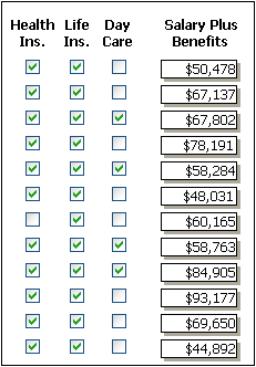 In the following report, the Salary Plus Benefits column has a Shadow box border around every data value in the column. To display the border, you set the border property for the column: