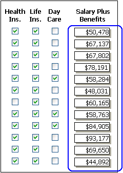 In the following report, the Salary Plus Benefits column has a Shadow box border highlighting each data value that is greater than $60,000: