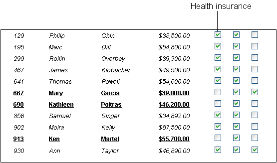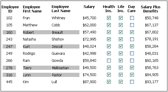 The following is a portion of the resulting report. Notice that the employee ID, first name, and last name have a gray background if the employee uses the day care benefit: