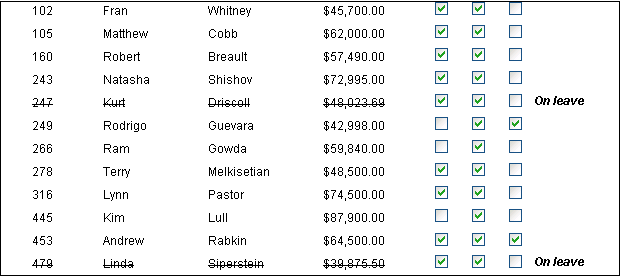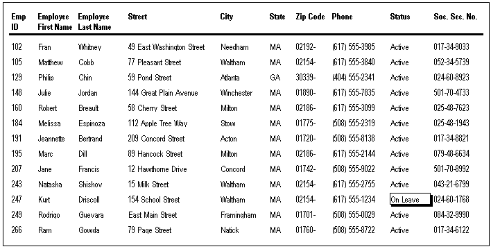 The following is a portion of the resulting report. Notice that the status On Leave displays with a Shadow box border: