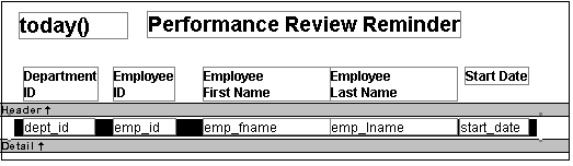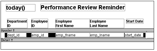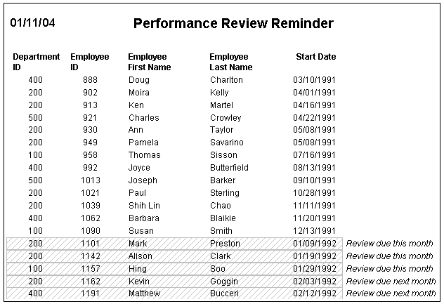 The following is a portion of the resulting report. A rectangle with light gray cross-hatching highlights employees whose reviews are due soon. The line enclosing the rectangle is Light Gray and uses the pen style Solid (0):