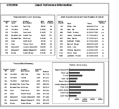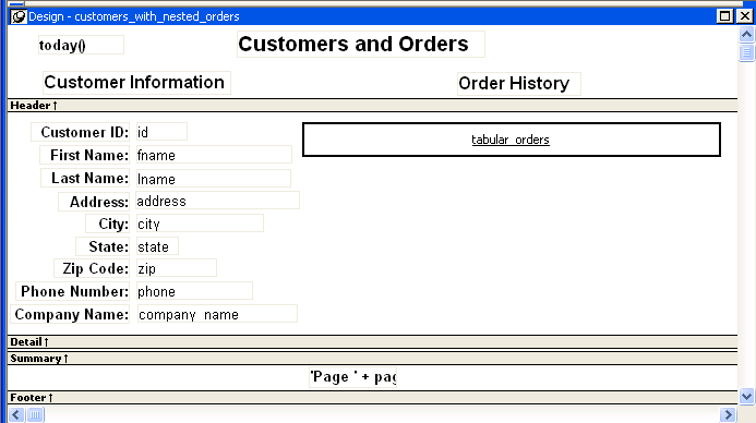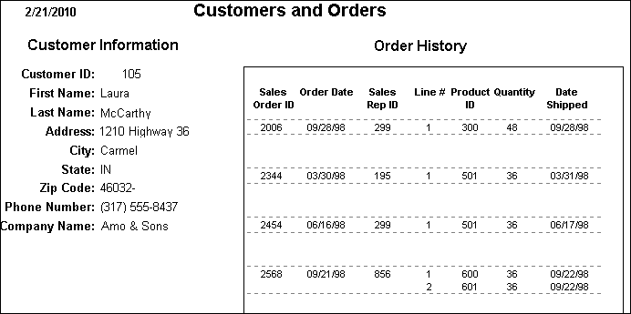 For example, the following freeform report lists all information about a customer and then includes a related nested report (which happens to be a tabular report). The related nested report lists every order that the customer has ever placed. The base report supplies the customer ID to the nested report, which requires a customer ID as a retrieval argument. This is an example of a master/detail relationship -- one customer has many orders: