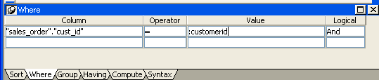 Define a retrieval argument in the Specify Retrieval Arguments dialog box. In the example, customerID is the name assigned to the retrieval argument.