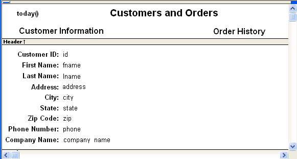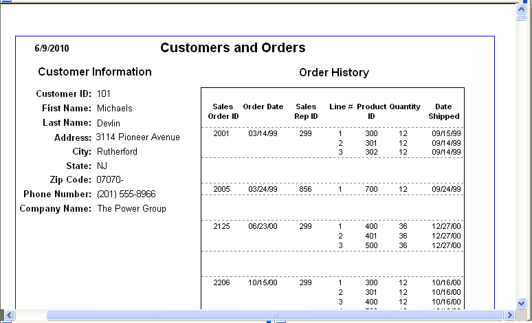 In the example, the base report is one that lists customers and has a place for the order history of each customer: