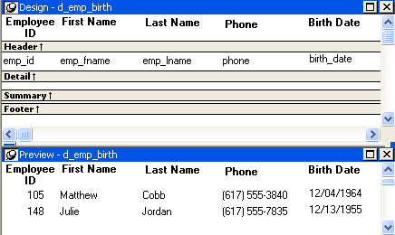 The report has five columns: emp_id, emp_fname, emp_lname, phone, and birth_date.