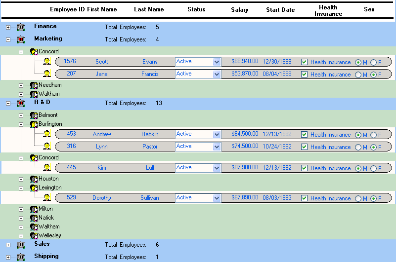 This sample TreeView report uses the department and employee tables in the PB Demo DB database and has two TreeView levels. The first level is the department name. The second level is the city where each employee resides. The detail data for each employee is grouped in TreeView leaf nodes under these two levels.