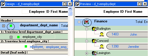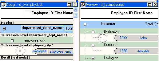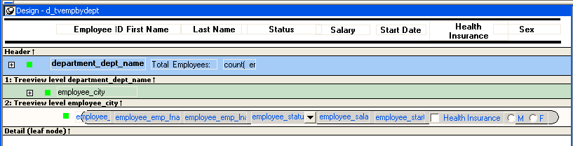 By default, the controls in the header band are the heading text of the detail band columns, and the controls in the detail (leaf node) band are all the column controls except for the first-level columns (in the 1:Treeview level band) that you selected when you used the TreeView wizard. Columns that you specify as additional levels remain in the detail band.