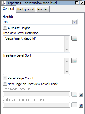 You set most TreeView report properties on the General page in the Properties view for the report.