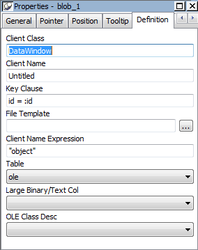 The following screenshot shows what a completed Definition page for a Blob object in a table called ole looks like in the Properties view: