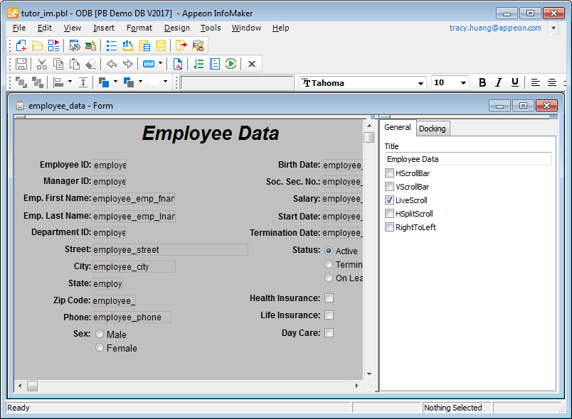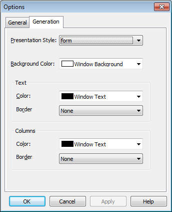 For Freeform and Grid style forms, you can specify the default colors and borders that InfoMaker uses when generating a basic form. Each style can have its own defaults. You can override the defaults for a style for a particular form.