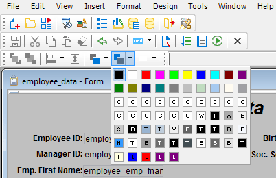 Foreground Color -- has foreground colors that you can choose for one or more selected controls. In a text control, the foreground color specifies the color of the text.