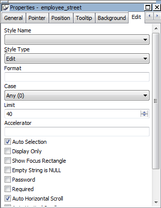 Here is the Properties view for the column employee_street. It has several tabbed property pages of information, which you access by clicking one of the tabs. For example, to choose an edit style for a column, you click the Edit tab: